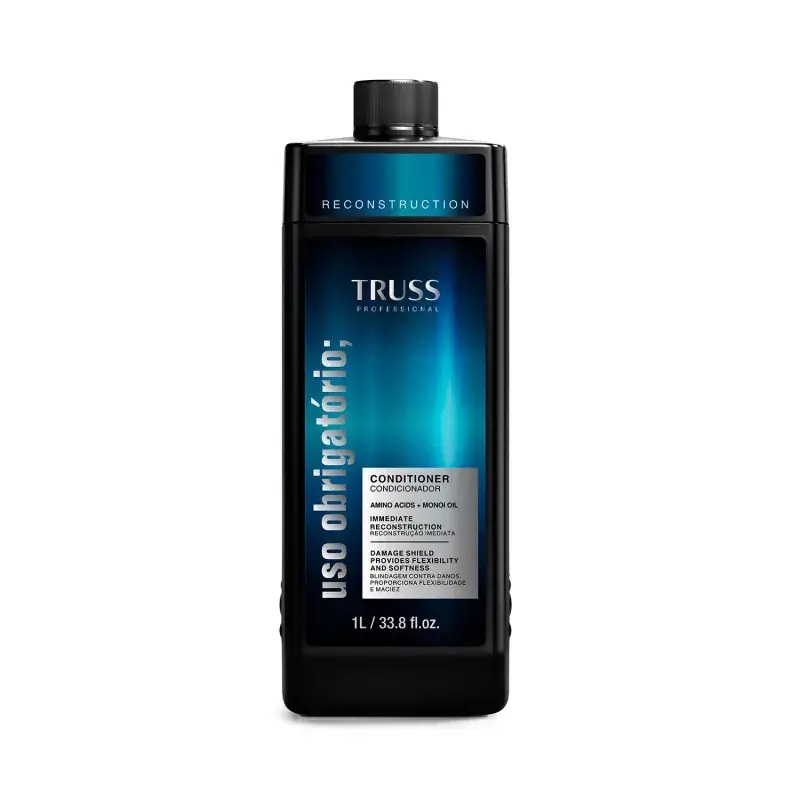O Condicionador Truss Uso Obrigatório possui ação antidesbotamento, elimina o frizz e confere brilho e suavidade aos fios, além de reduzir os danos em cabelo com química e selar as cutículas.