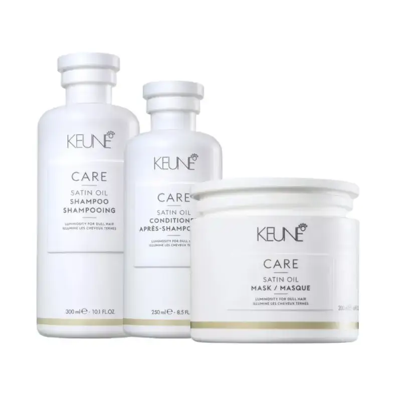 Kit de tratamento para cabelos ressecados. Keune Care Satin Oil Tratamento Profundo recupera o brilho e a maciez com nutrição profunda dos fios.