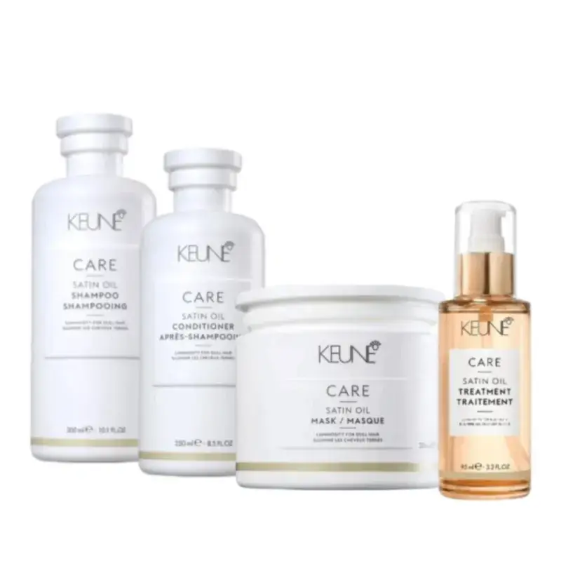 Kit de tratamento para cabelos ressecados. Keune Care Satin Oil Tratamento Profundo recupera o brilho e a maciez com nutrição profunda dos fios.